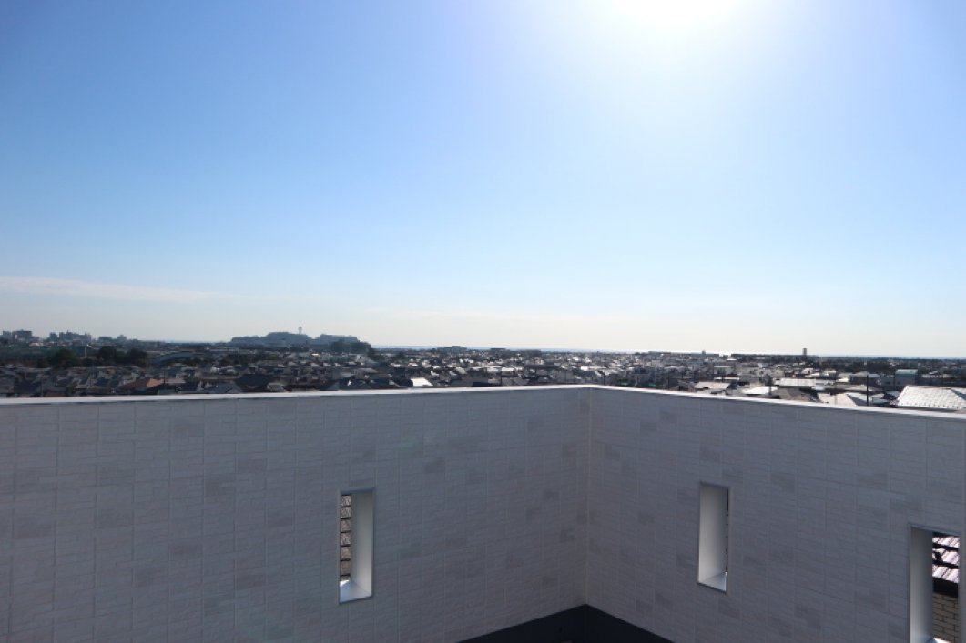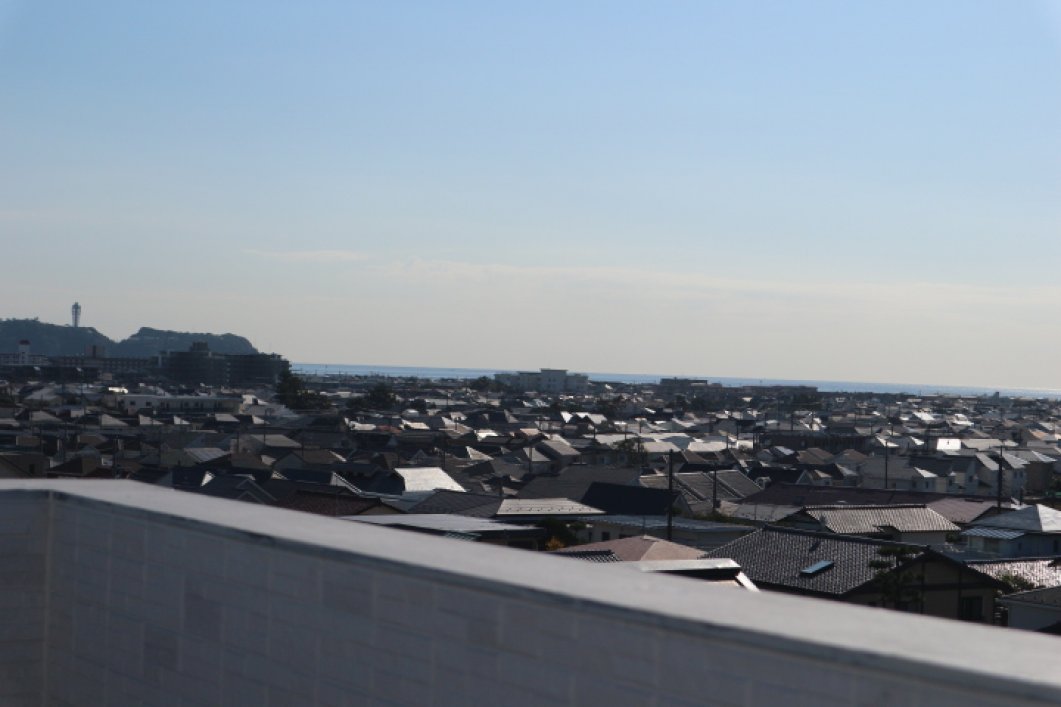 ルーフバルコニーからオーシャンビューで江ノ島から富士山まで湘南の景色を一望できます。広いルーフバルコニーはBBQ、