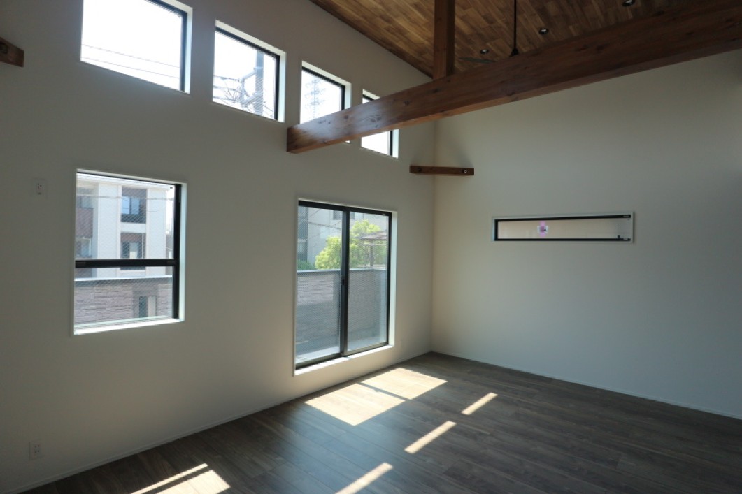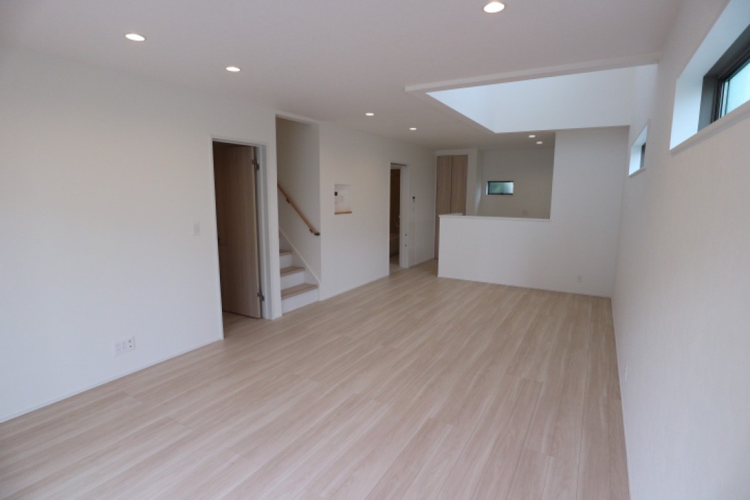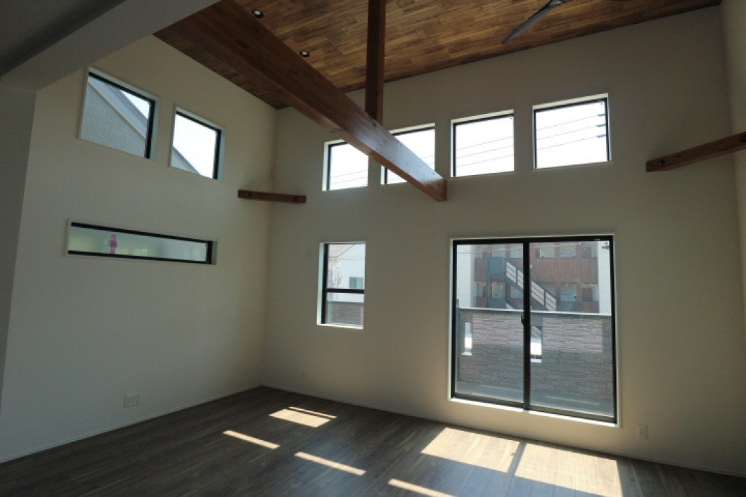 ◆A号棟リビング20帖超の広さと、勾配天井で陽当り良好です。